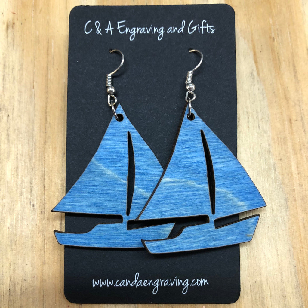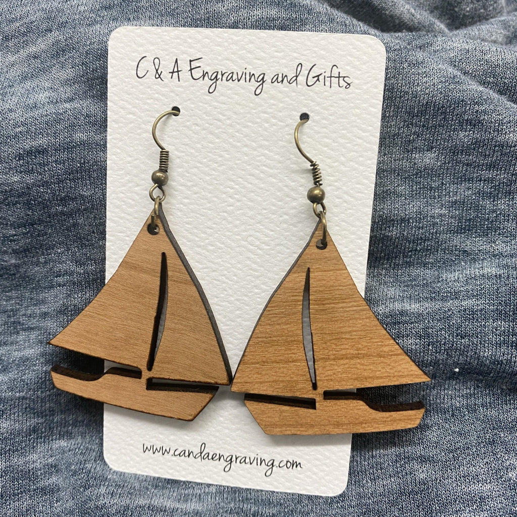 Refresh availabilityThese cute dangle wooden earrings are in the shape of a sailboat. They are made from stained birch wood and are laser cut out.