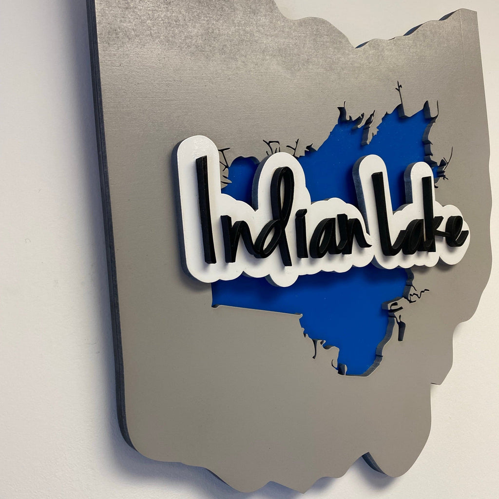 Refresh availabilityThis layered sign will brighten anyone’s lake house or cottage. The lake outline is cut out of wood in the Ohio shape and has an Indian Lake font placed on top. This is painted blue, gray, white and black.