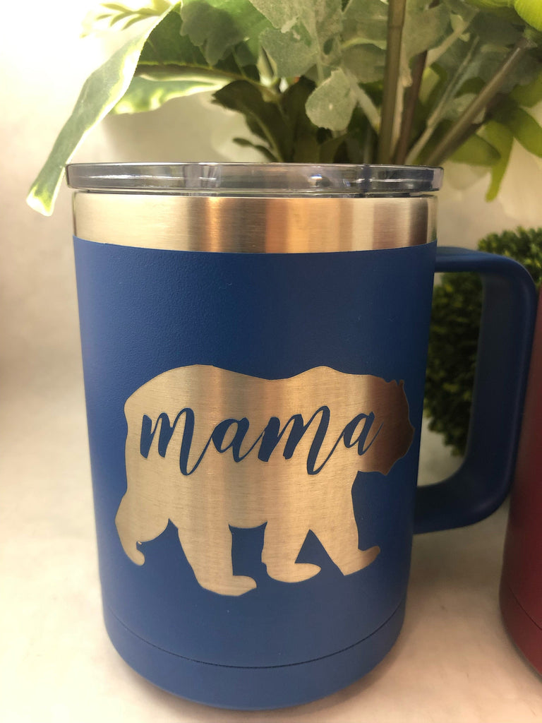 Mama Bear Tumbler Mug Engraved with Slide Lid. Papa Bear Engraved Coffee Cup.