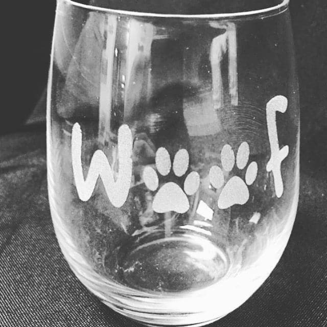 Refresh availabilityDog lover stemless wine glass laser engraved with the word "WOOF".