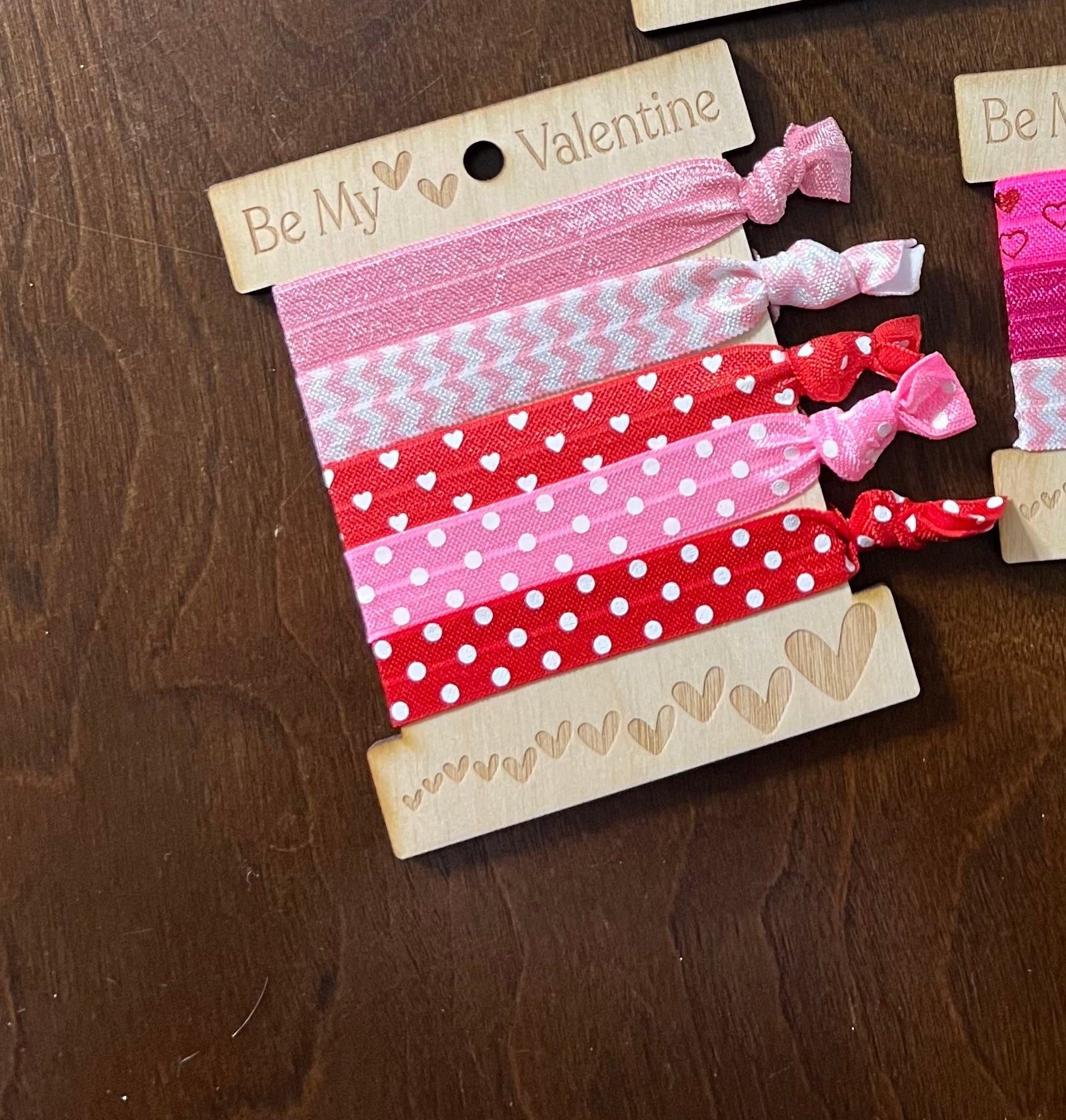 Each one is made of stretchy elastic and tied with a knot. Set of 5 hair ties come wrapped around a wooden engraved backer that says “Be My Valentine.”